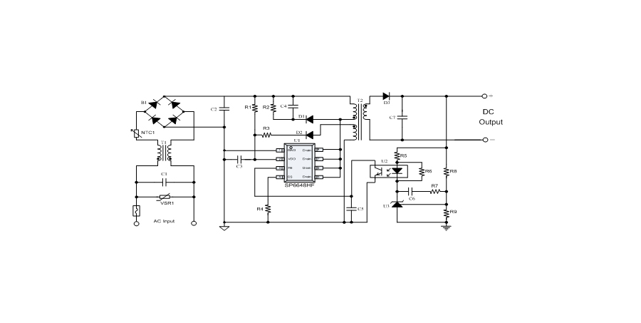 SP6648HF是一顆電流模式PWM控制芯片,內(nèi)置650V高壓功率MOSFET,應(yīng)用于功率在18W以內(nèi)的方案。SP6648HF在PWM模式下工作于固定開關(guān)頻率,這個(gè)頻率是由內(nèi)部精確設(shè)定。在空載或者輕載時(shí),工作頻率由IC內(nèi)部調(diào)整。芯片可以工作在綠色模式,以此來減小輕載時(shí)的損耗,提高整機(jī)的工作效率。SP6648HF在啟動(dòng)和工作時(shí)只需要很小的電流,可以在啟動(dòng)電路中使用一個(gè)很大的電阻,以此來進(jìn)一步減小待機(jī)時(shí)的功耗。芯片內(nèi)置有斜坡補(bǔ)償電路,當(dāng)電路工作于大占空比時(shí),避免次諧波振蕩的發(fā)生,改善系統(tǒng)的穩(wěn)定性。內(nèi)置有前沿消隱時(shí)(Leading-edge blanking time),消除緩沖網(wǎng)絡(luò)中的二極管反向恢復(fù)電流對電路的影響。SP6648HF采用了抖頻技術(shù),能夠有效改善系統(tǒng)的EMI性能。系統(tǒng)的跳頻頻率設(shè)置在音頻(22KHz)以上,在工作時(shí)可以避免系統(tǒng)產(chǎn)生噪音。SP6648HF內(nèi)置多種保護(hù),包括逐周期限流保護(hù)(OCP),過載保護(hù)(OLP),過壓保護(hù)(VDD OVP),VDD過壓箝位,欠壓保護(hù)(UVLO),過溫保護(hù)(OTP)等,通過內(nèi)部的圖騰柱驅(qū)動(dòng)結(jié)構(gòu)可以更好的改善系統(tǒng)的EMI特性和開關(guān)的軟啟動(dòng)控制。