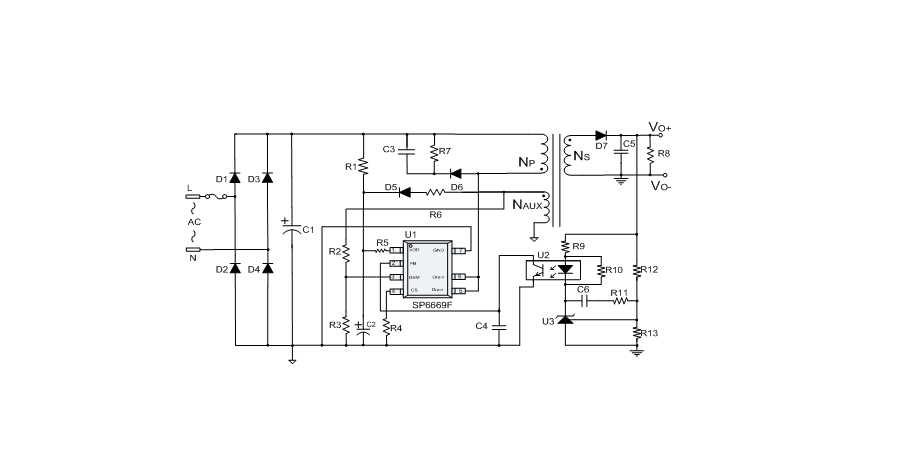 SP6669F內(nèi)置多種保護,包括:輸入電壓過低保護(Brown-out),輸入電壓過高保護(Line-ovp),輸出電壓過壓保護(VO_OVP),輸出二極管短路保護,逐周期過流保護(OCP),過載保護(OLP),VDD過壓保護(OVP),VDD欠壓保護(UVLO),過溫保護(OTP)等。