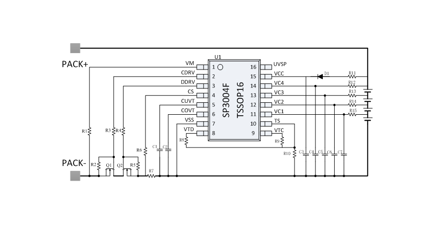 SP3004F是一款用于4串鋰電池的保護(hù)芯片,SP3004F 內(nèi)部集成了高精度的電壓、電流檢測電路,能夠?qū)崿F(xiàn)每串電池的過壓、欠壓保護(hù),以及整串電池的充電過流、放電過流、短路保護(hù)和充放電的溫度保護(hù)等。SP3004F 內(nèi)部集成 N 型MOSFET 的驅(qū)動電路,能夠直接驅(qū)動外部 N 型充電管和放電管,既可以兼容充放電分口應(yīng)用,也可以兼容充放電同口應(yīng)用。