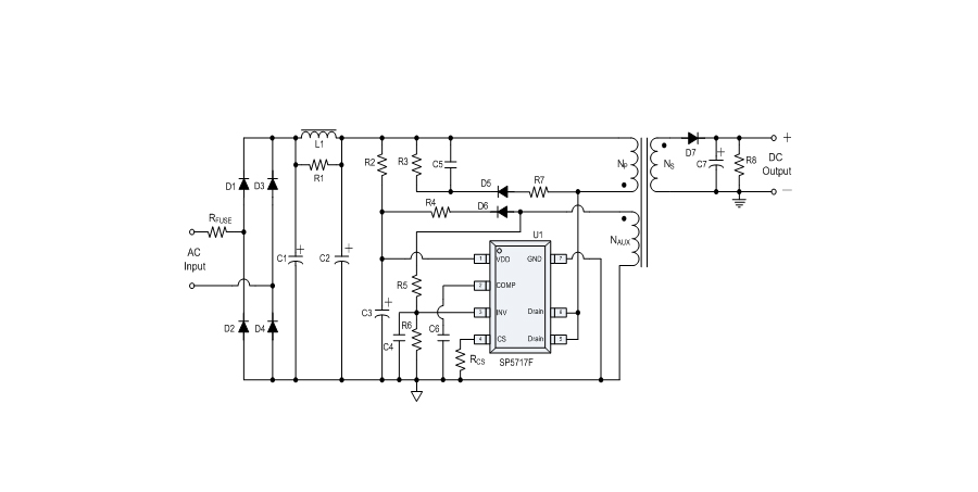 SP5717F是一顆高精度離線式開關電源電路,應用于低功耗AC/DC充電器與適配器。SP5717F使用原邊取樣來進行精確的恒流、恒壓控制,可以省去一般應用中的光耦與TL431。