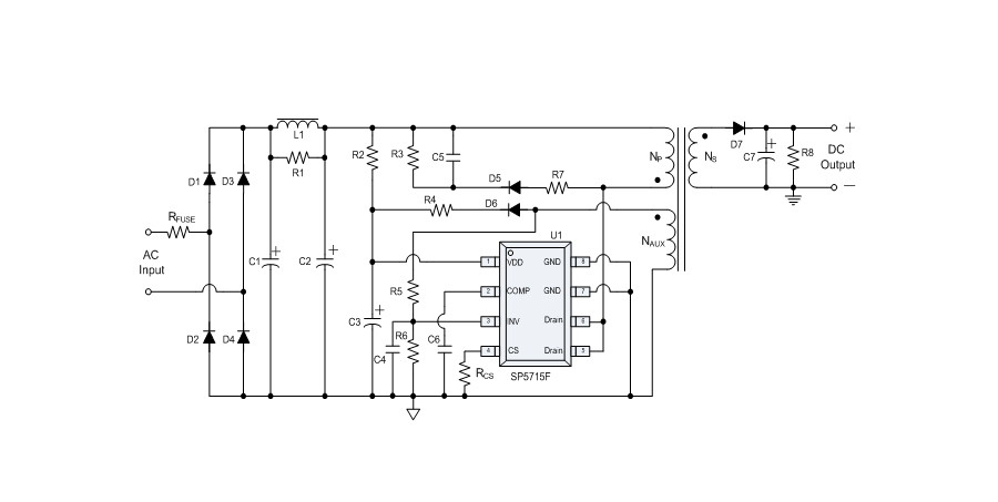 SP5715F是一顆高精度離線式開關電源電路,應用于低功耗AC/DC充電器與適配器。SP5715F使用原邊取樣來進行精確的恒流、恒壓控制,可以省去一般應用中的光耦與TL431。